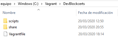 inside the folder we created the following structure, 2 folders and a file called Vagrantfile: